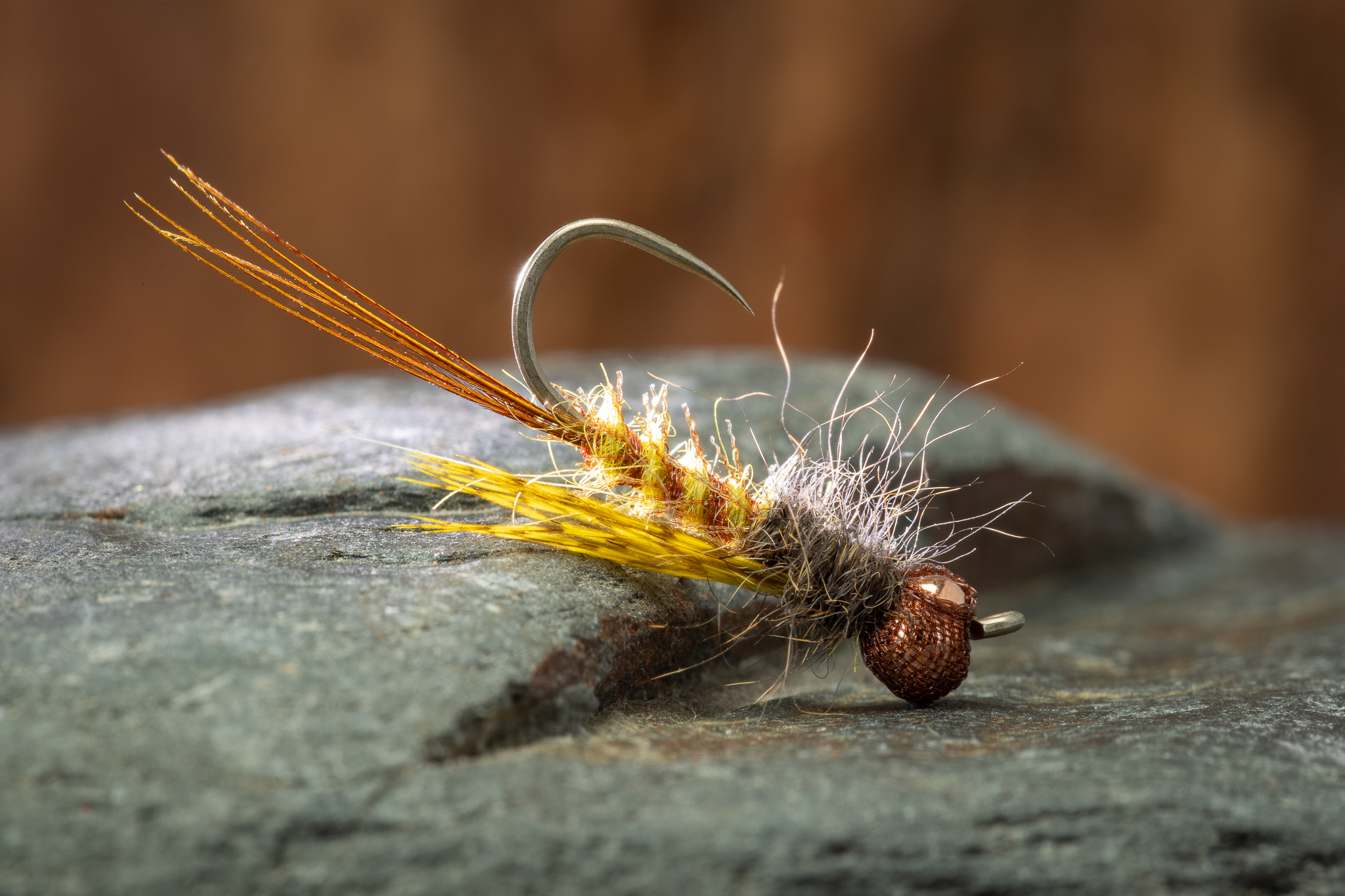 Sometimes tungsten beads are a necessity when you might rather not have one. A chunk of metal at the front of the hook may look out of place and spoil the look of an imitation, at least to the tyer, if not the fish. However, if you are fishing a deep pool or a fast run having some weight in your fly may be required to avoid it drifting totally ignored over the fish. You can of course use some copper, or other wire wrapped around the hook and hidden under the dressing, but that can bulk out a slim pattern and doesn’t add nearly as much weight as a tungsten bead. One approach that I use in several of my patterns is to disguise the bead, in this case by turning it into a head with multifaceted insect eyes.