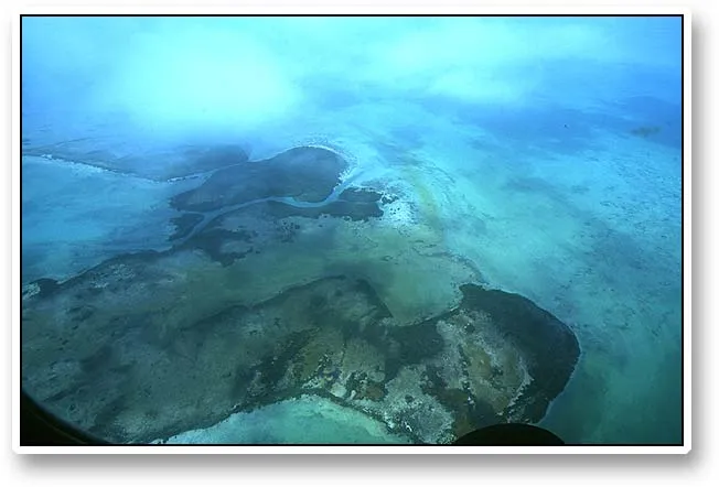 This view from the plane between Ambergris Caye and Belize City shows a typical mangrove island: little dry land, lots of central mud flats (potential bones) and extensive deeper flats to the right (potential tarpon).